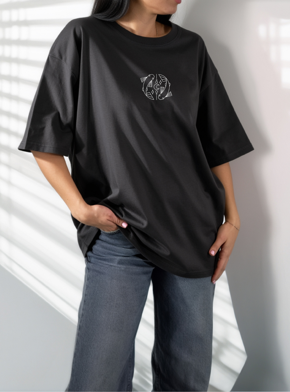 moteriski juodi medvilniniai marskineliai su issiuvinetu zodiaku zuvis